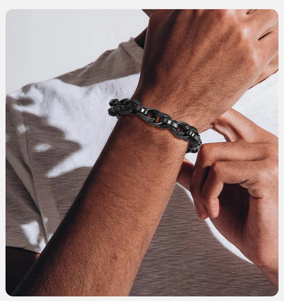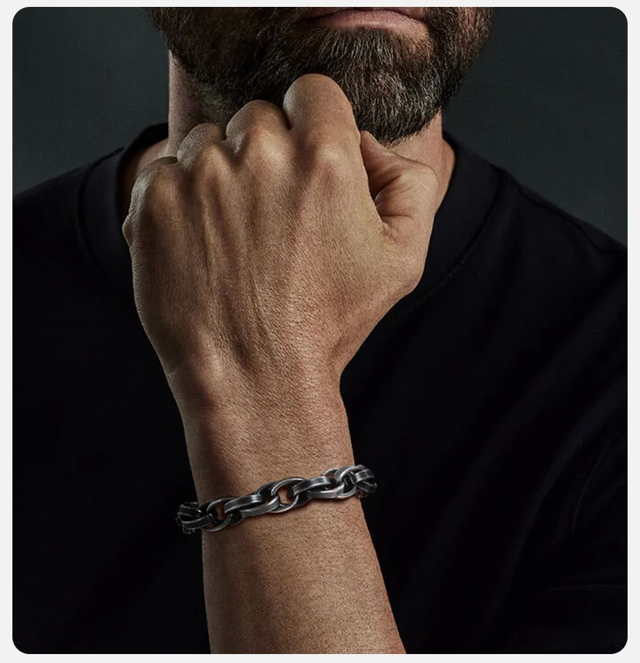 Esta pulseira é a escolha definitiva para o homem que se posiciona com confiança e estilo robusto. Ela é o contraponto perfeito para a simplicidade, elevando o visual com uma dose imediata de ousadia.