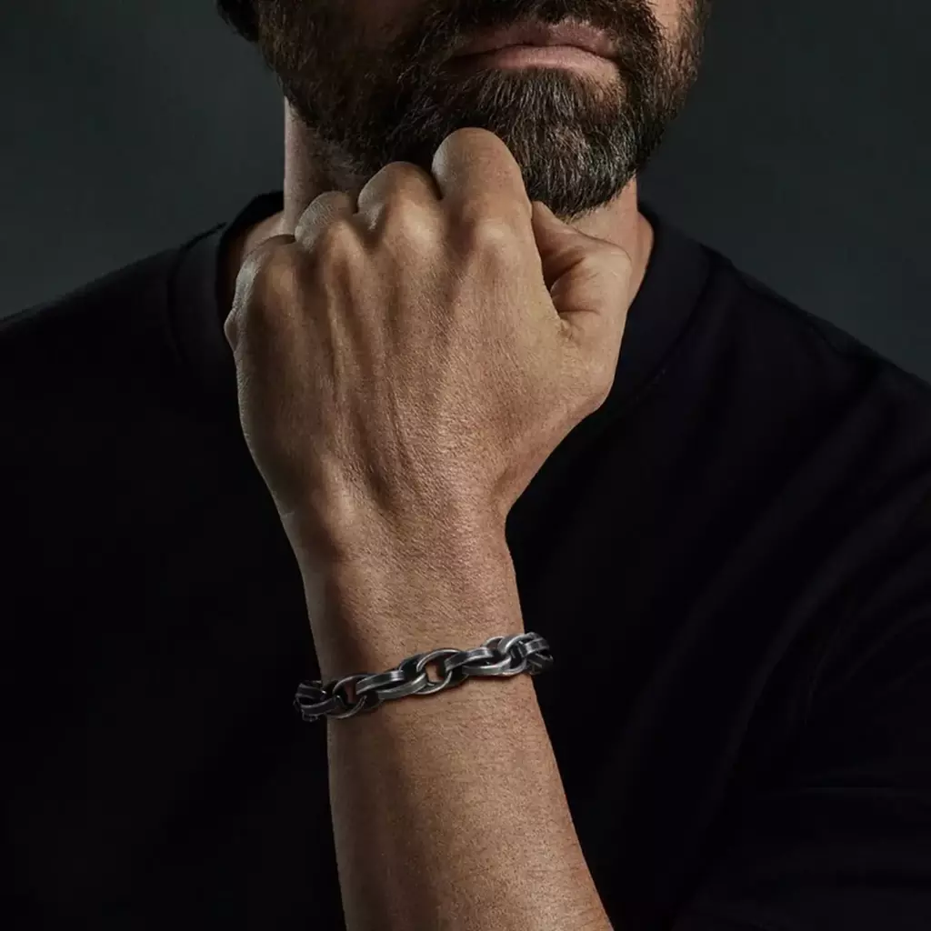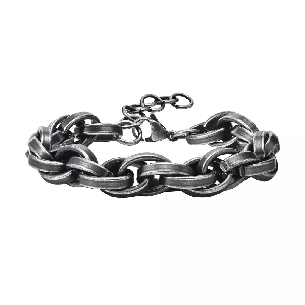 Design e Textura: A malha é grossa, mas ergonomicamente desenhada para o conforto. Os elos são polidos nas superfícies externas, mas o grande trunfo é o acabamento Oxidado (escurecido nas ranhuras), que confere uma profundidade de cor e um charme vintage, como se a peça carregasse uma história.