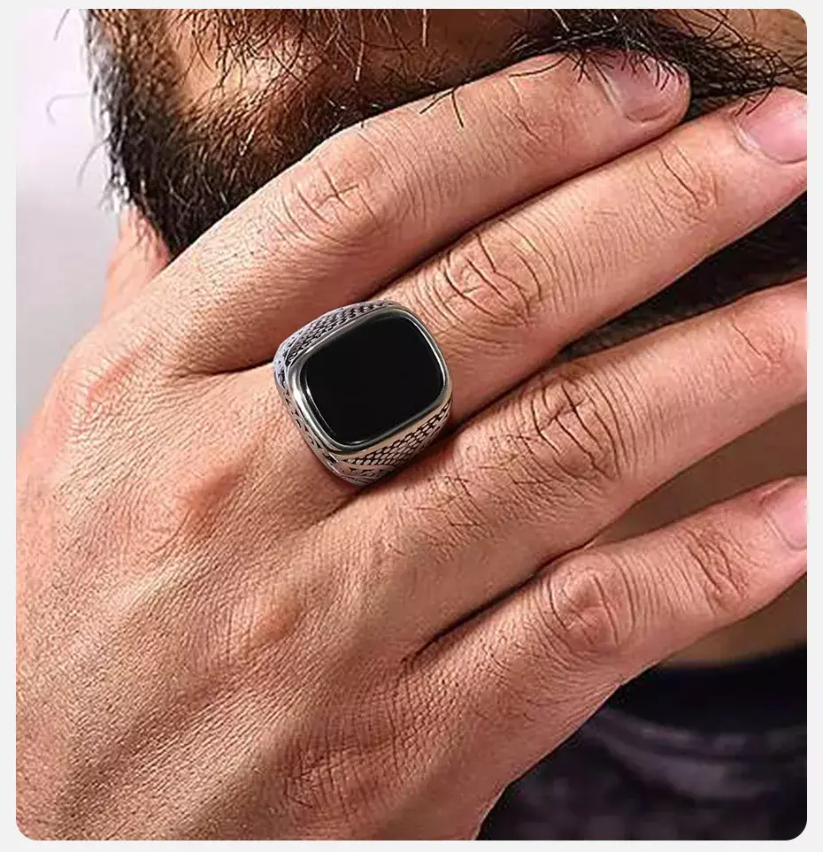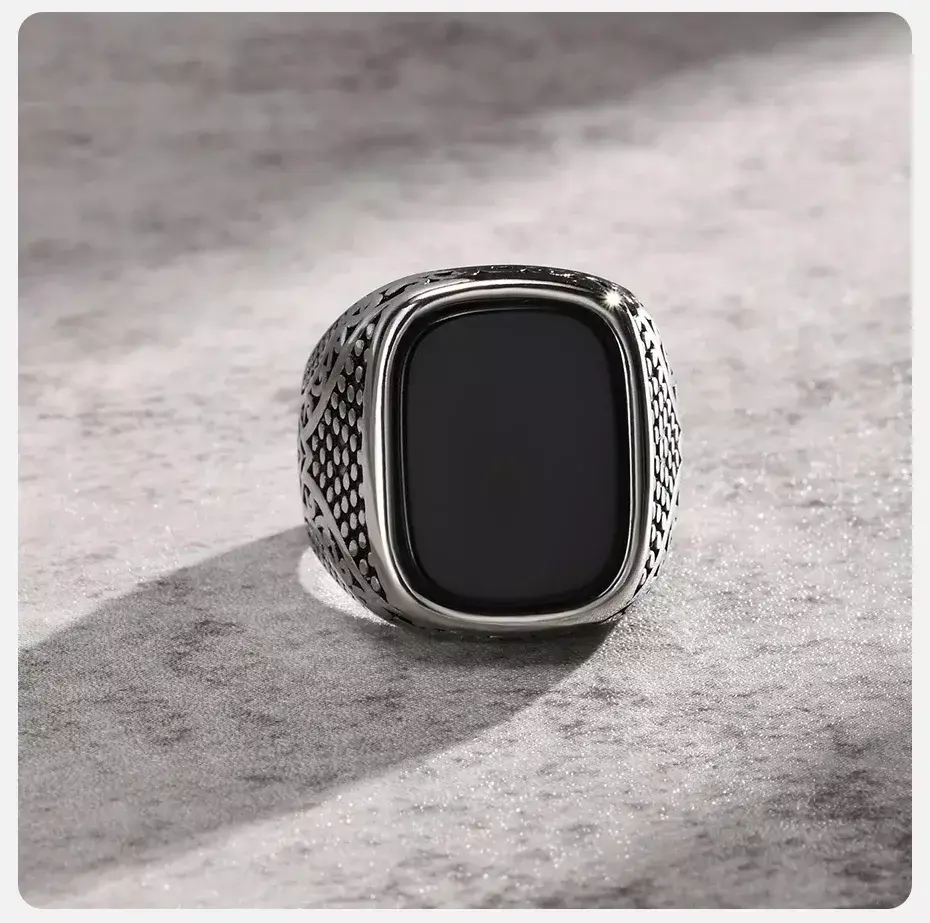 Design de Impacto: O formato quadrado/retangular da pedra ônix cria uma silhueta robusta e decidida. Ele atrai olhares e estabelece uma imagem de confiança e seriedade, seja em uma reunião de negócios ou em um evento social exclusivo.